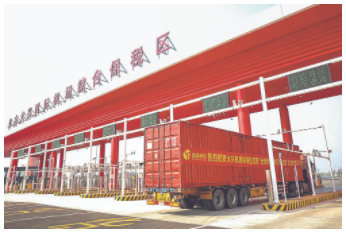 北京大兴国际机场综合保税区地跨河北省廊坊市和北京市大兴区两地,是全国唯一一个跨省市建设的综合保税区。自今年4月25日首批货物通关以来,实现进出口额2.3亿元。图为在北京大兴国际机场综合保税区河北廊坊侧3号主卡口,集装箱货车正在通过。本报记者 贾珺 摄