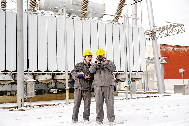 12月11日,国网廊坊供电公司大屯220千伏变电站里,变电运维三班的霍志越、李世晓正在设备区进行特巡。