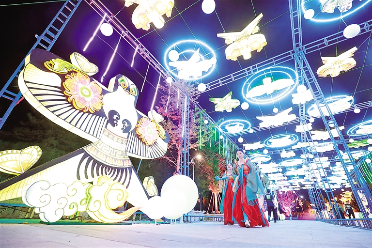 高达12米的“琼楼望舒”灯光璀璨,气势如虹;《千里江山图》的“只此青绿”美轮美奂,吸睛无数;穿梭在《山海经》的“奇幻山海”间,绛纱灯典雅飘逸,如同进入“奇幻世界”……9月14日晚,位于安次区御龙河公园的廊坊千灯会以130余组灯组2000余个单体彩灯点亮“中秋之夜”,吸引众多市民游客深度体验文旅交融的“中式夜游”。