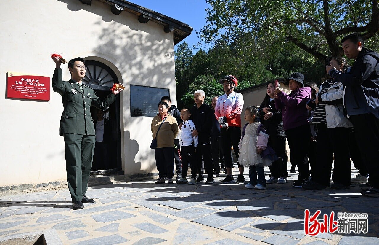 10月1日,西柏坡纪念馆讲解员范浩天(左一)在党的七届二中全会会址前为游客表演快板。河北日报记者 史晟全摄