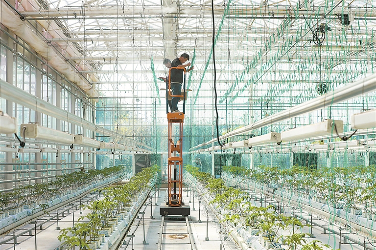 图为在农业农村部规划设计研究院设施农业研究所永清精准实验基地内,工作人员为新栽种的西红柿绕蔓。记者 王静 通讯员 庞趁友 摄