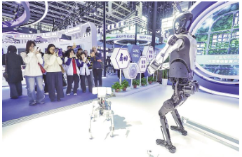 10月18日,在2025中国国际数字经济博览会廊坊展区内,润泽科技有限公司展位上的人形机器人吸引参观者围观拍照。 本报记者 陈童 摄
