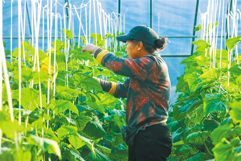 永清县龙虎庄乡大青垡村,农户管护大棚黄瓜。 记者 王静 通讯员 庞趁友 郑亚彬 摄