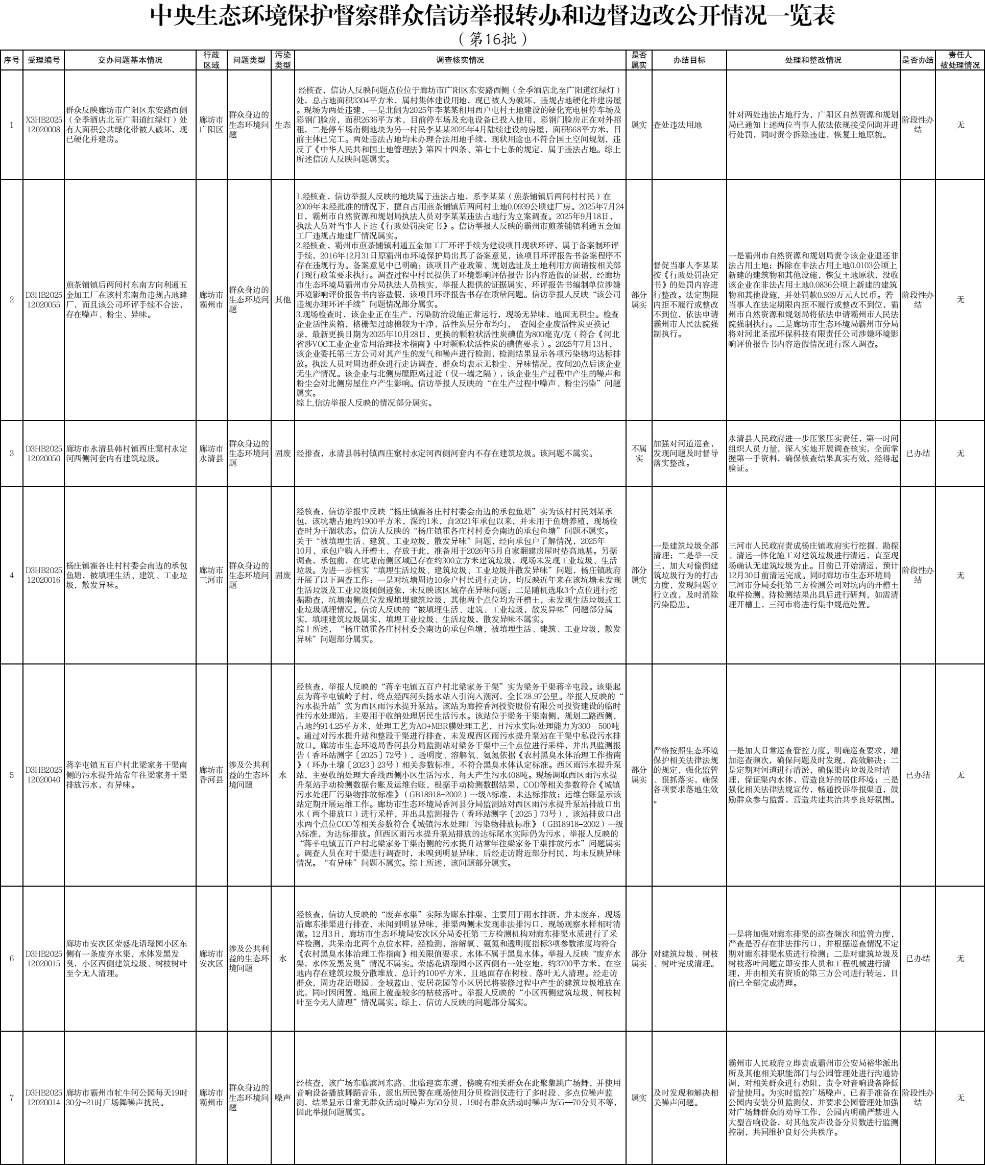 中央生态环境保护督察组交办廊坊市第十六批群众信访举报案件办理情况