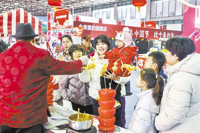 国际年货节上,现场表演吹糖人儿吸引市民驻足观看。记者 贾珺 摄