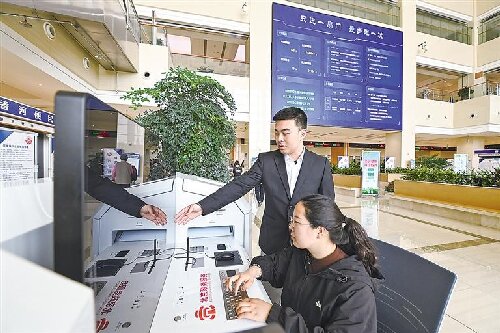 在香河县北京城市副中心政务服务中心一体化办事大厅内,工作人员正在为市民办理业务。
