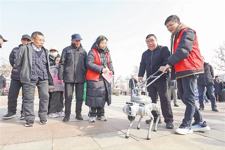 图为盲人群众在志愿者引导下体验智能导盲机器狗。记者 董旭旭 摄