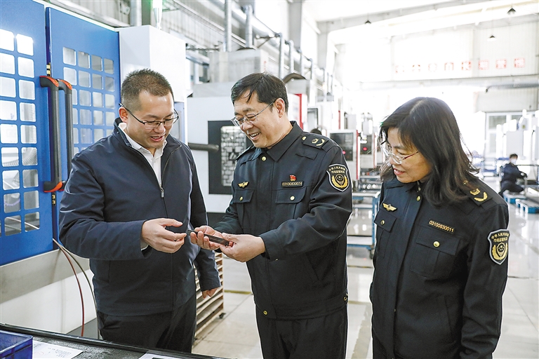 图为大厂回族自治县市场监督管理局工作人员在河北晶碳科技有限公司生产车间,了解企业知识产权运用及融资需求情况。 通讯员 李浩 记者 王娜 摄