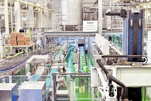 4月17日,位于大厂回族自治县的廊坊顶津食品有限公司无菌生产车间,自动化流水线高速运转。